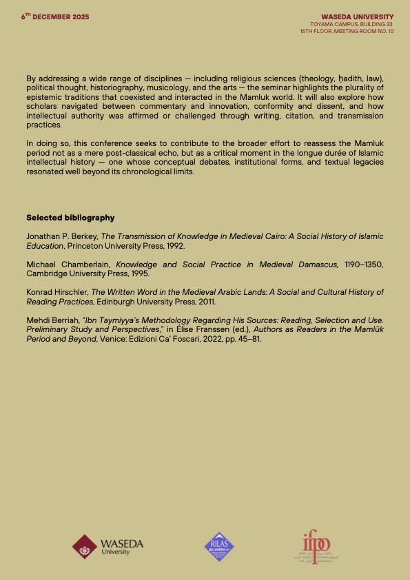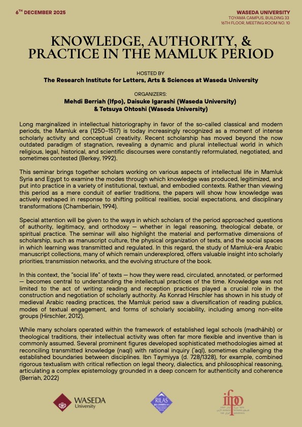 国際セミナー”Knowledge, Authority, & Practice in the Mamluk Period” のお知らせ